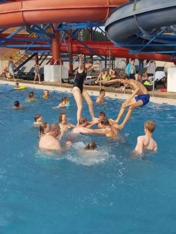 Na de lunch was het tijd om verkoeling te zoeken in het Aquapark. Iets later dan gepland vertrokken we vanaf het YWAM huis. Soms is het moeilijk te begrijpen dat als je op tijd weg wil dat iederéén dan de handen uit de mouwen moet steken. Het zwembad was heerlijk. Tijd om van de glijbanen af te gaan en na al het bouwen bij Frank was er ook nog teambuilding in het water. Bommetje maken was verboden maar toen de badmeester even niet keek werden er toch echt Hollandse bommetjes gemaakt.