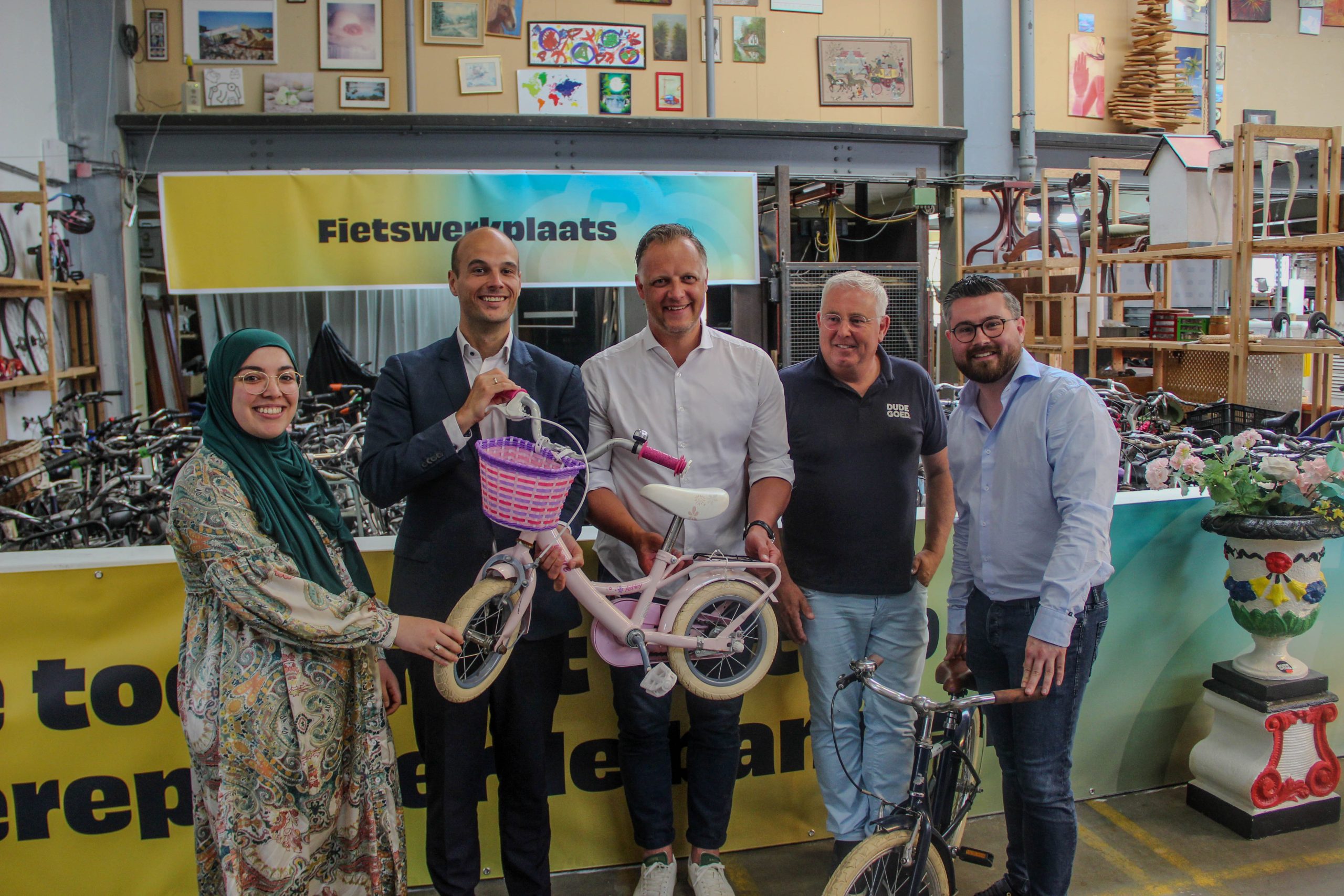 Wethouder Gijs van Malsen was erbij, samen met betrokkenen van KEI en Dude Goed. Er zijn al ruim 200 fietsen ingezameld; 68 zijn opgeknapt en klaar voor uitgifte via KEI.